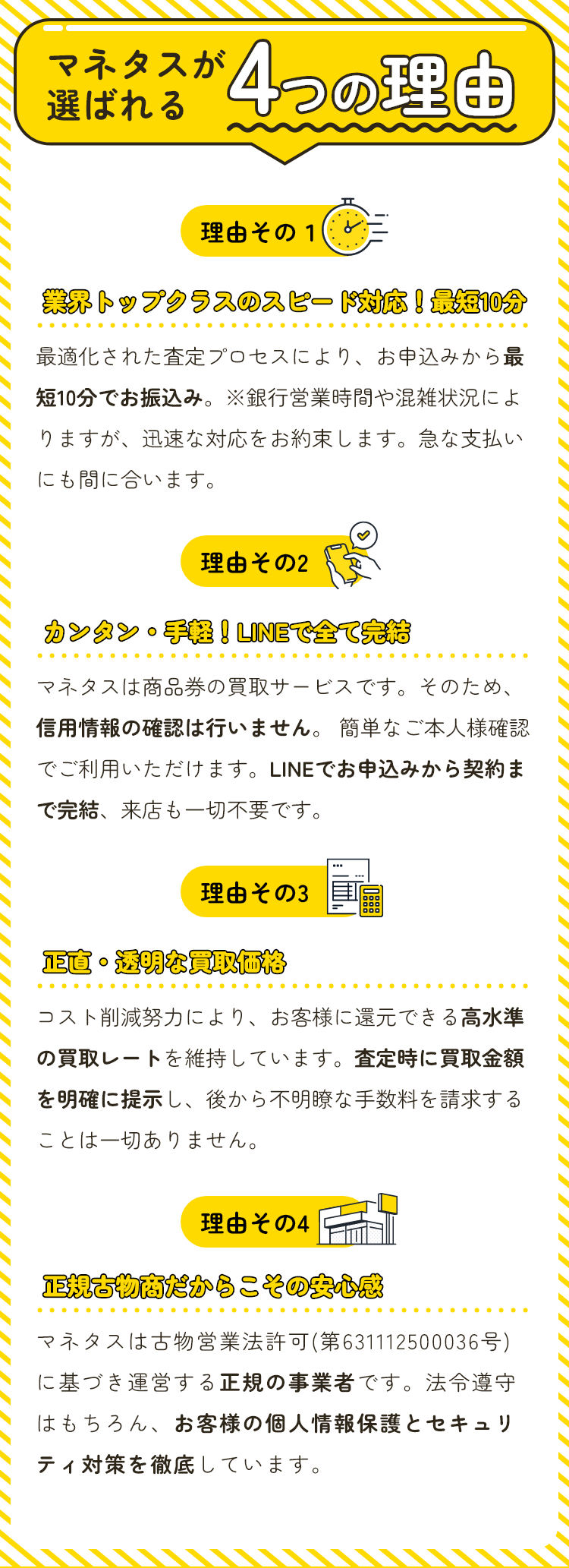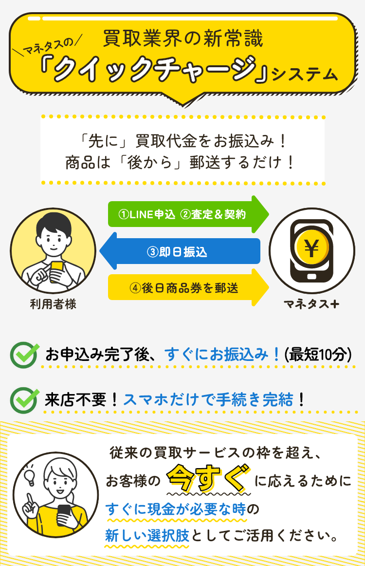 ※1 査定完了から振込完了までの最短時間。申込時間や混雑状況により変動する場合があります。※2 買取率は商品の種類や市場価格、発送タイミングにより変動します。※3 16時以降のお申込みは、翌営業日の対応となる場合があります。※4 古物営業法に基づく買取サービスであり、金融商品ではありません。